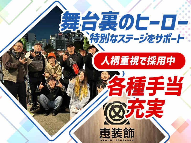 動画あり給与UP株式会社恵装飾【経験者歓迎】賞与年3回◎感動を創るステージ施工で安定収入をbg_027a正月給24.936万円~49.7279万円bg_006b| 勤務 |大阪市都島区 / 京橋駅| 面接 |大阪市都島区 / 京橋駅 (徒歩 4分)bg_008b正イベント会場設営、資材搬入・荷揚げ、リフォーム・内装bg_012b正09:00~09:00シフト相談応募する電話する